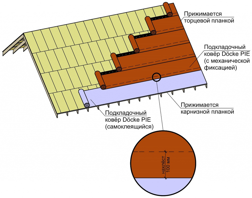 самоклеящийся — в зонах с наибольшей вероятностью скопления воды и снега и, соответственно, протечек (карниз, ендова, примыкания, мансардные окна и т. д.);