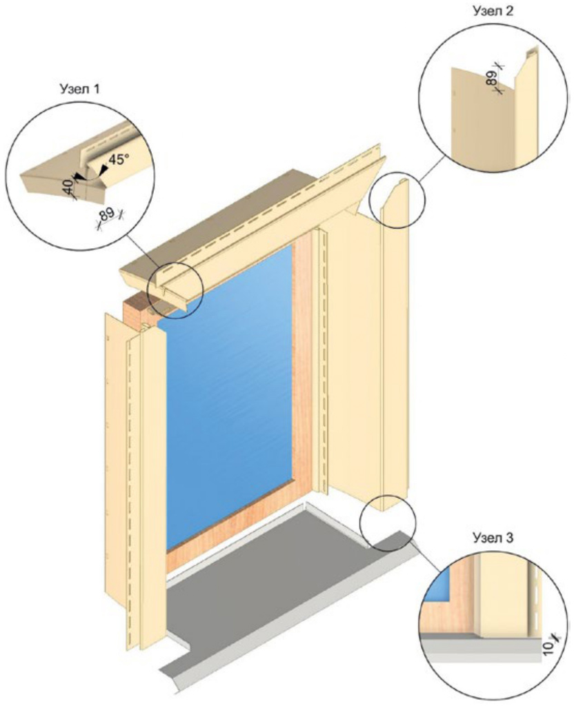 Перед установкой наличника по всему периметру окна на расстоянии 2-3 мм от внутреннего края проёма необходимо установить отрезки стартового профиля из ПВХ для сайдинга Döcke необходимой длины, который предварительно необходимо подрезать по всей длине нижней кромки на расстояние 5 мм. Далее следует подготовить два наличника на верхнюю и нижнюю части проёма, а также два наличника на боковые стороны. Длина всех элементов должна быть равной высоте и ширине проёма плюс две высоты используемых наличников. На верхнем горизонтальном наличнике по краям профиля необходимо осуществить подрез под углом 45° (узел 1, рис. 9), а в боковых наличниках под 45° подрезать только нижние части (узел 3, рис. 9). У верхнего наличника по торцам профиля с каждой стороны следует сделать надрезы (язычки) длиной около 20 мм и отогнуть вниз для отвода воды с верхнего наличника. У верхнего края бокового наличника необходимо подрезать внутреннюю часть согласно узлу 2, рис. 9.