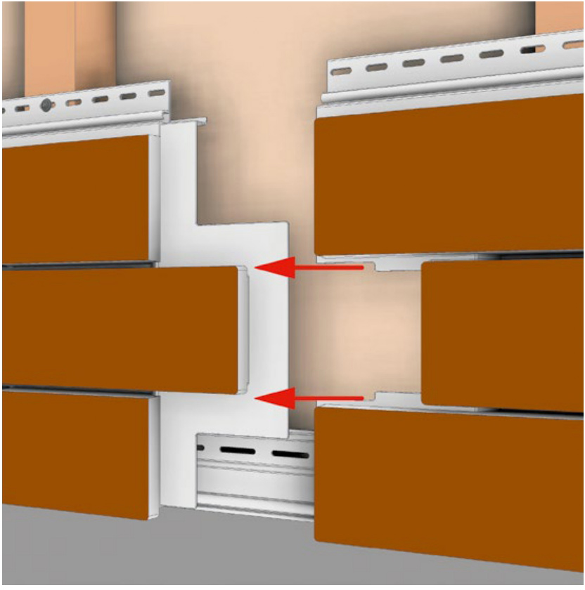 Далее необходимо смонтировать панели сайдинга с учётом теплового зазора между торцами панелей и внутренними рёбрами углов BERGART или ROCKY. Затем следует установить нижний угол BERGART или ROCKY на стартовый угол и зафиксировать его вверху при помощи 2 саморезов. Вышележащие углы BERGART или ROCKY снизу зацепляются за нижележащие, а сверху фиксируются 2 саморезами (рис. 8).