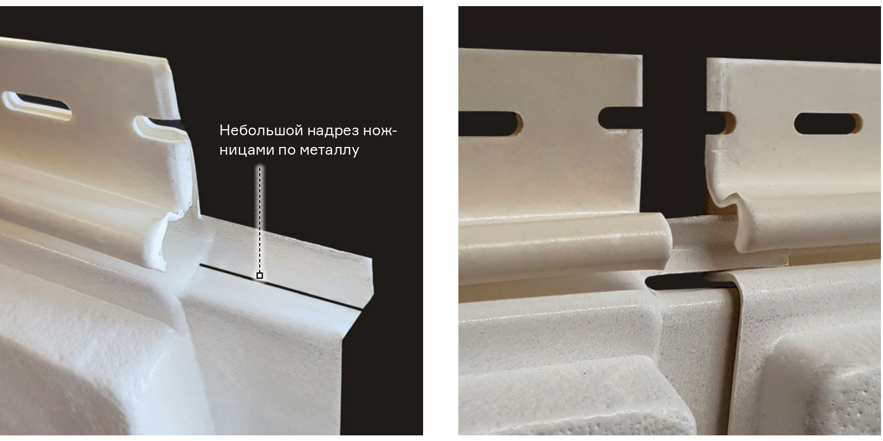 В случае, если расстояние от ближайшей стойки обрешётки до верхней части вертикального замка панели превышает 100 мм, для усиления жёсткости соединения необходимо сделать надрез на замке левой панели (рис. 17 слева). Затем следует загнуть получившийся язычок левой панели и завести его в замок правой панели (рис. 17 справа).