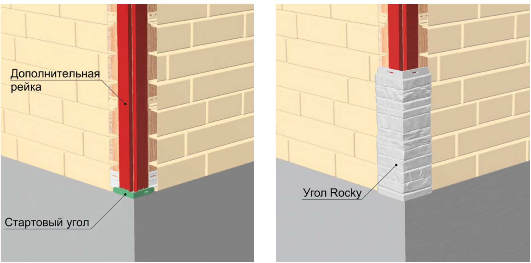 На внешних углах здания необходимо нарастить обрешётку на 10-15 мм при помощи рейки шириной 50 мм, на которую следует закрепить стартовый угол STEIN, STERN, SLATE для угла ROCKY и стартовый угол BERG, FLEMISH для угла BERGART при помощи 2 саморезов (рис. 7).